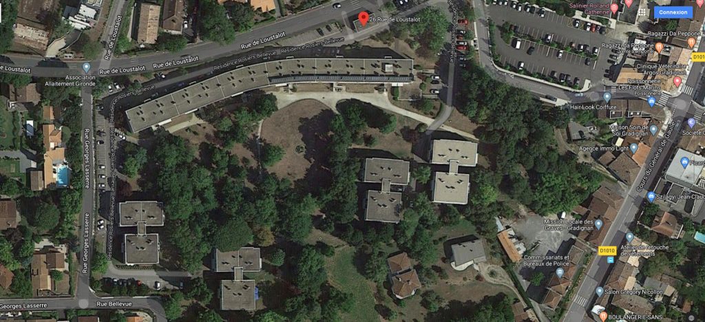 La résidence Rosiers-Bellevue est située 26, rue de Loustalot en hyper-centre de Gradignan. Elle est idéalement située à proximité de tous les commerces et des services. C’est une résidence de grand standing dont la construction remonte à 1964. Elle dispose d’un magnifique parc de 1,6 hectares autour duquel sont répartis 5 bâtiments (un en R+3 et 4 en R+2).